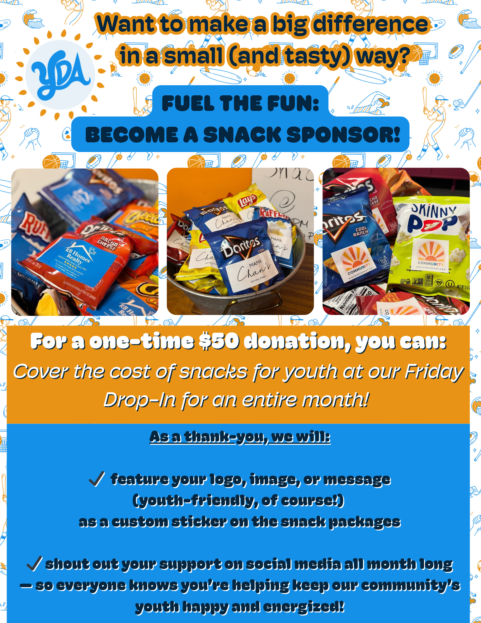 A one-time $50 donation covers the cost of Drop-In snacks for a whole month!